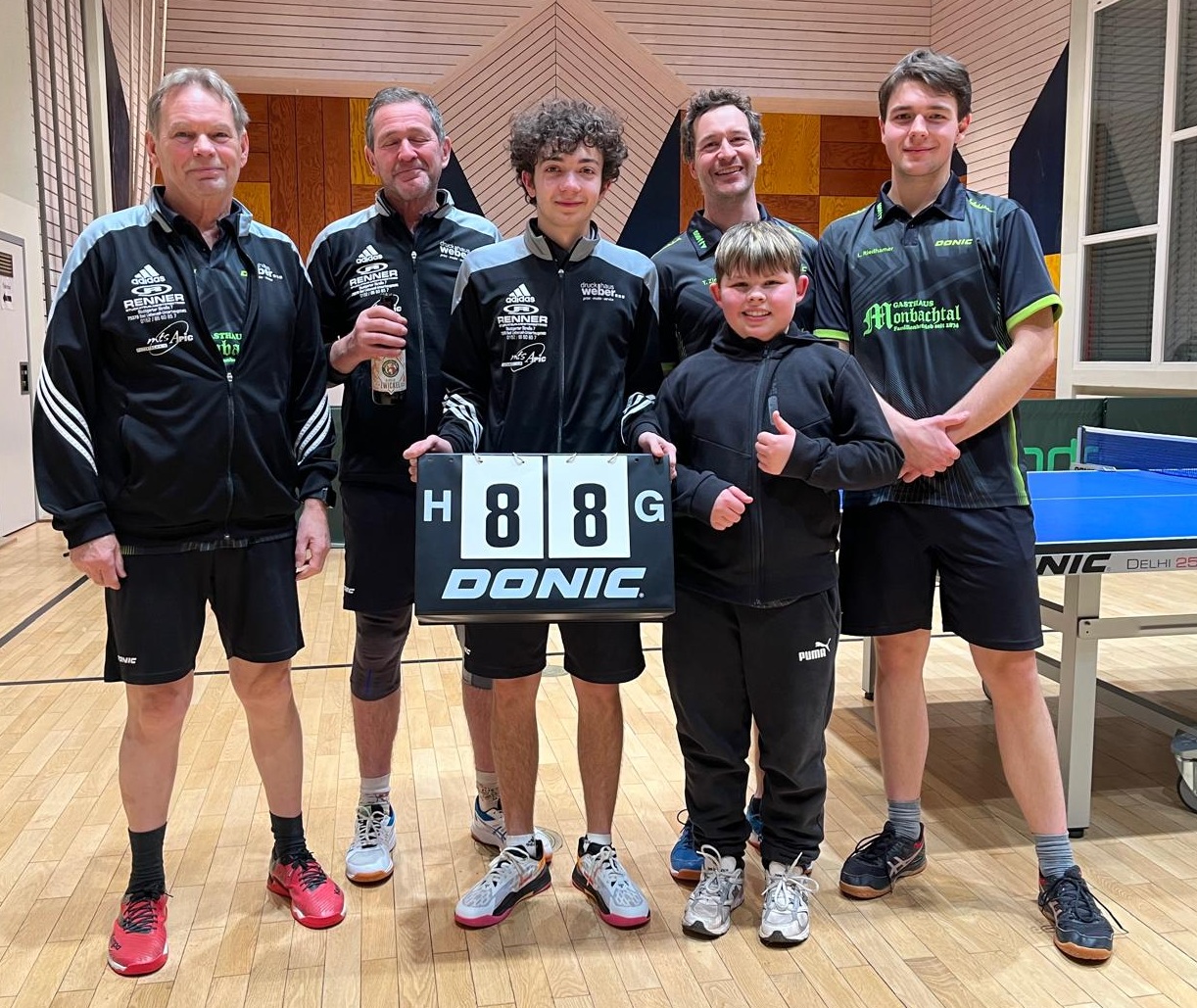 Was für eine Sensation! Einen sehr guten Start hatte man mit dem Gewinn aller 3 Eingangsdoppel. Hendrik / Lasse, Martin / Dieter und Tobi / Lenn waren erfolgreich. Hendrik konnte mit seinem Sieg auf 4:0 erhöhen. Durch 3 Siege in Folge konnten die Gäste auf 4:3 verkürzen. Lenn konnte mit einem klaren 3:0 Erfolg auf 5:4 erhöhen. Hendrik konnte auch sein 2. Einzel erfolgreich gestalten und erhöhte auf 6:4. Die nächsten beiden Spiele gingen an die Gäste. Beim Spielstand von 6:6 konnten Dieter und Lenn mit 2 knappen Erfolgen die wichtigen Punkte zum 8:6 erzielen. Das letzte Einzel ging im 5. Satz an Birkenfeld. Das Schlussdoppel musste letztendlich im 4. Satz abgegeben werden. Endstand 8:8. Eine starke Mannschaftsleistung hat zu diesem Punktgewinn gegen den Tabellenführer beigetragen.